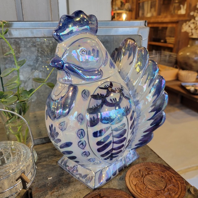 高さ25cm程度 奥行18cm程度 幅16cm程度 キラキラなニワトリの容器です。 ふっくらしたおなか部分に何かこっそり収納できます。 目立った傷や欠けはありません。